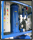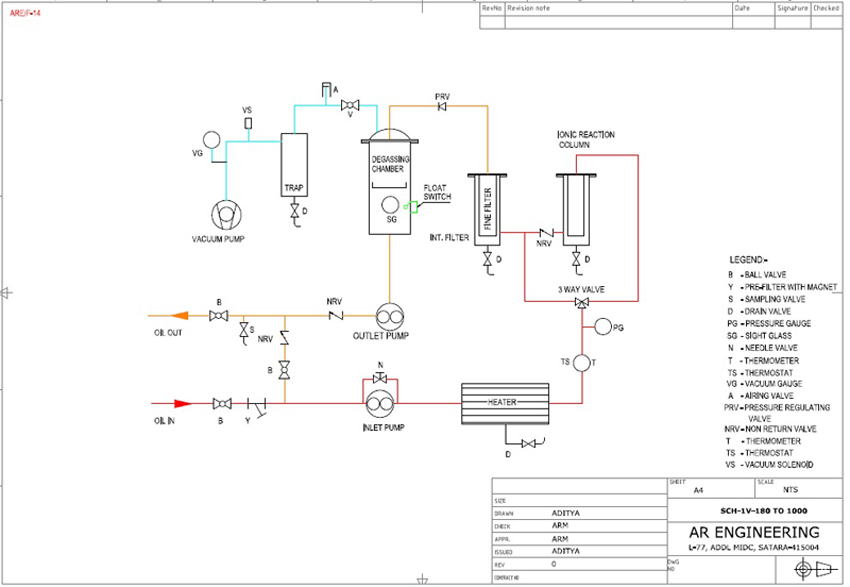 1. OIL TRANSFER & CIRCULATING SYSTEM : It mainly consists of Inlet Pump (Gear type positive displacement), Outlet Pump (Positive displacement Gear type or Glandless Centrifugal) and necessary valves & piping as per the schematic diagram to ensure easy operation and maintenance. Complete system is vacuum tight to have a leak-proof operation. The piping joints are flanged type with O’rings. Chambers are provided with suitable draining arrangement.