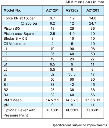 DESCRIPTION : These Low block cylinders are suitable for clamping work pieces from the sides where clamping is not possible from top. Hydraulically operated piston pushes the pivoted lever against the work piece. By positioning the pivot lever it is possible to have a downward force in addition to horizontal push force to clamp the work piece firmly on to workrest. This prevents lifting of component.