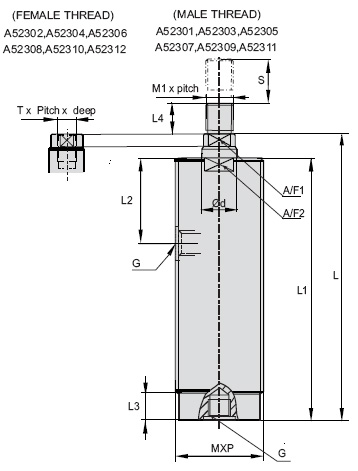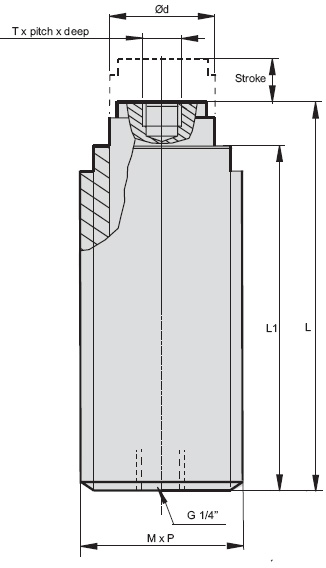 Double Acting Mini Threaded Cylinders are designed for heavy duty Hydraulic clamping forces. Hydraulic inlet port is at the bottom and declamping port is at the side.