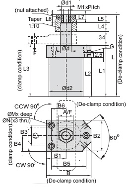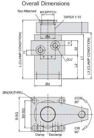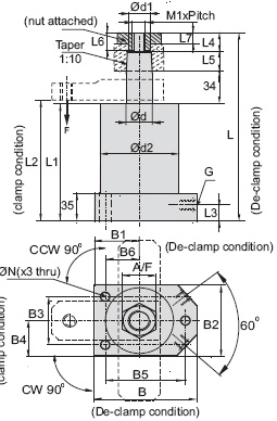 These Hydraulic Clamping elements are pull type swing cylinder, wherein a part of the total stroke is used to swing the arm (stroke to swing). The shorter part is available as clamping stroke. These swing clamps are having a special feature during the rotation (swing), it covers 10mm stroke and thereafter travels vertically for 14mm clamping stroke. The total stroke is 24mm.