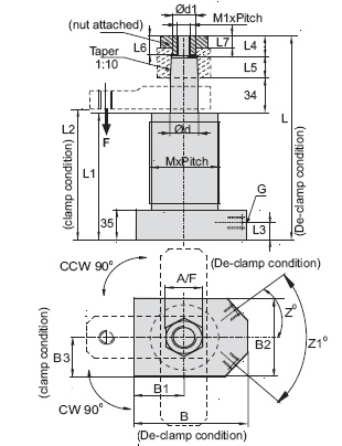 These Hydraulic Clamping elements are pull type cylinder, wherein a part of the total stroke is used to swing the piston (stroke to swing). The shorter part is available as clamping stroke. These swing clamps are having a special feature during the rotation (swing, it covers 20mm stroke and thereafter travels vertically for 10mm clamping stroke. The total stroke is 30mm.